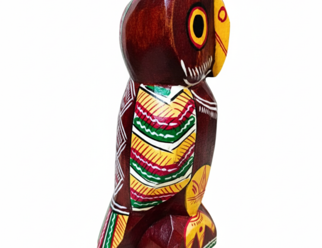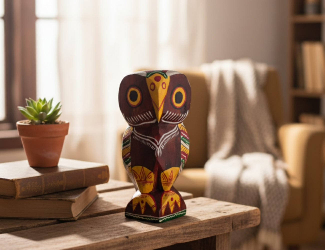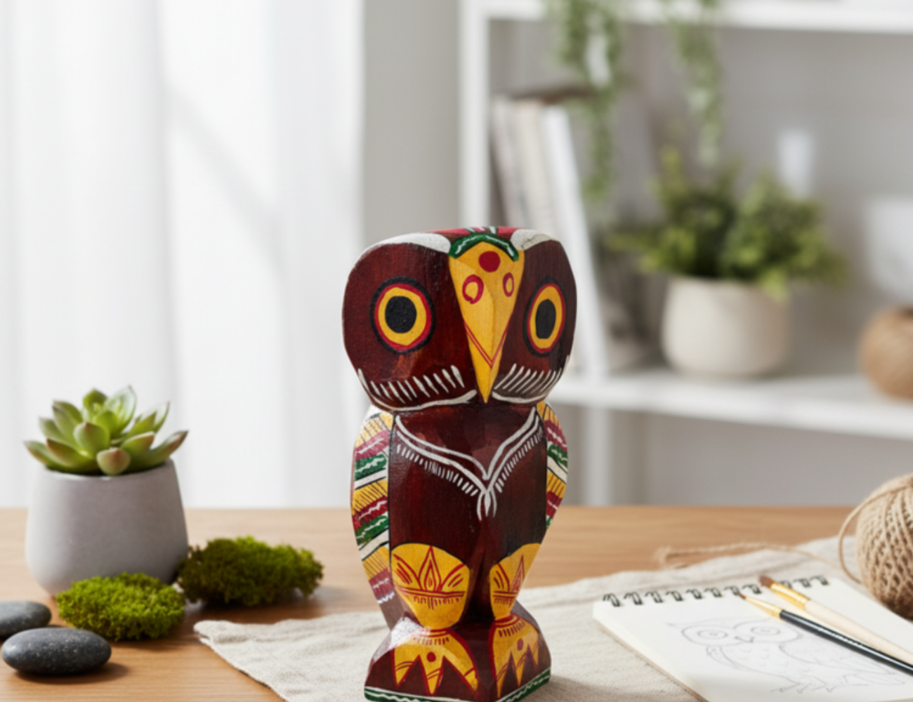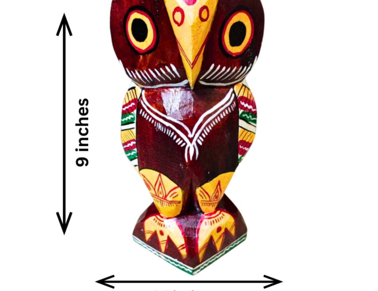 Bring home the charm of Indian tribal artistry with this handcrafted wooden owl showpiece by GAAOO. Measuring 9 inches tall, this beautifully hand-painted figurine is made from high-quality solid wood and features vibrant traditional patterns. Its compact 3.2-inch base width makes it perfect for tabletops, office desks, living room decor, or gifting. Every piece is carefully carved and painted by skilled artisans from West Bengal, ensuring uniqueness and premium craftsmanship. Ideal for home decoration, festive gifting, office aesthetic enhancement, or spiritual symbolism.